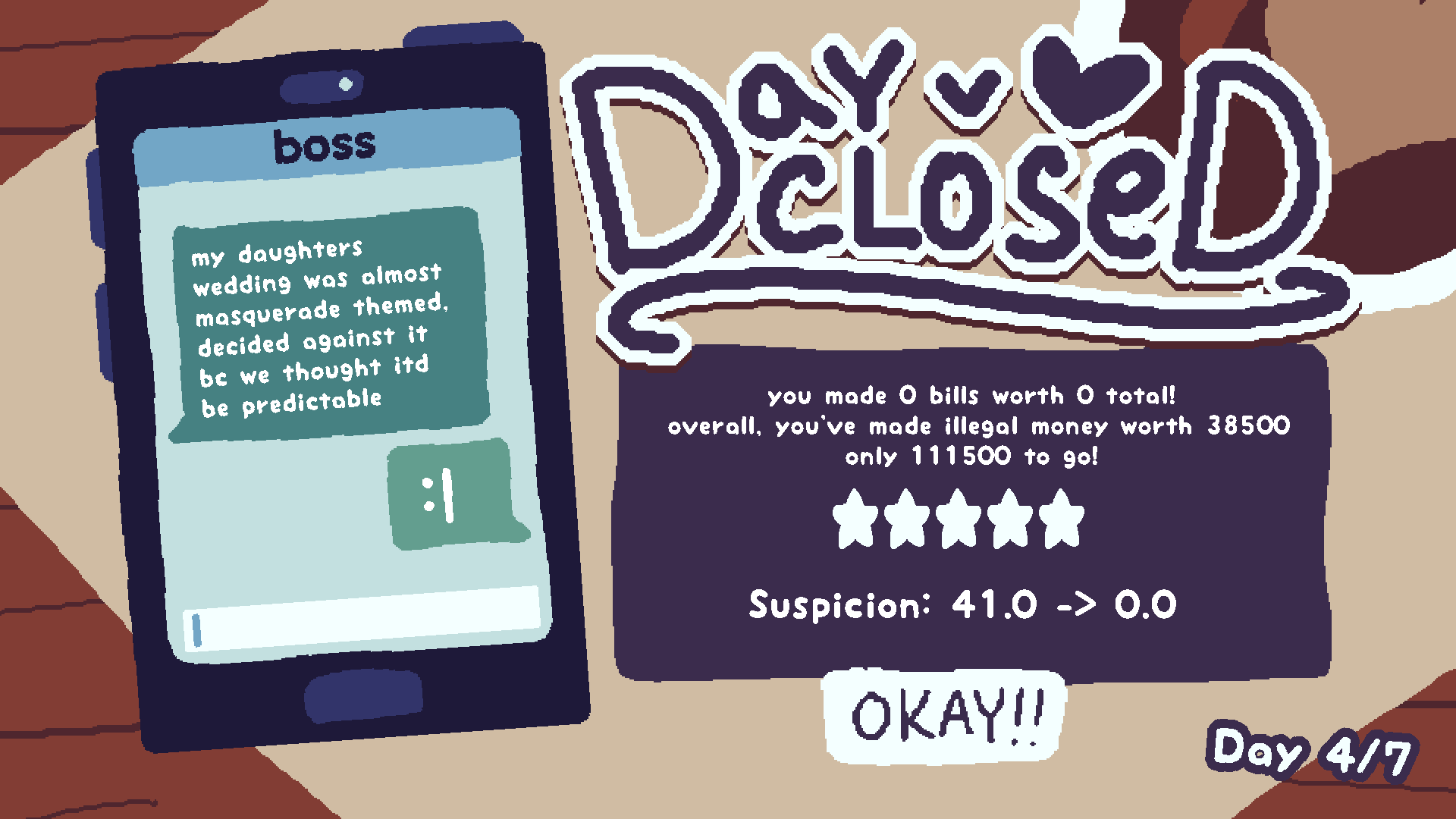 Toe the line in this management game by forging money and serving customers at the same time! Work hard enough to get good ratings and avoid suspicion, but don't forget to actually make your illegal money... lest you get fired!